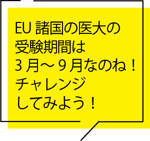 (注意)EUの医大の受験期間は3月から9月くらいまで続きます。日本の医大に入れなかったとしても、その年度中にEUの医大を受験できます。浪人しなくてもエージェント独自の「(短期)受験対策コース」やPre-Medical Schoolを受ければ合格の可能性が高くなります。