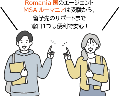 Romania国の場合は、大学がエージェント政策をとっていないため、「公式留学エージェント」は存在しませんが、長年Romania国を拠点にして多くの日本人のサポート実績をもつ「MSAルーマニア」(弊社パートナー会社)という日本人だけの会社(これ以降「MSA」と省略します)があります。社長はRomania国在住の日本人医師です。日本人のきめ細かいサービスをRomania国から実施し、6年間サポートも別料金で依頼可能です。